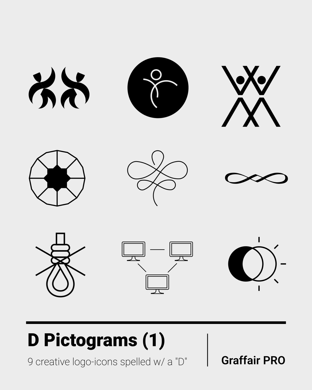 D Pictograms (1): The first set of nine pictograms, each beginning with a "D". These pictograms are part of the "1150 SVG Pictograms" mega bundle, which includes 1150 others.