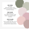 + Detailed Hex Codes, RGB, and CMYK values for each color