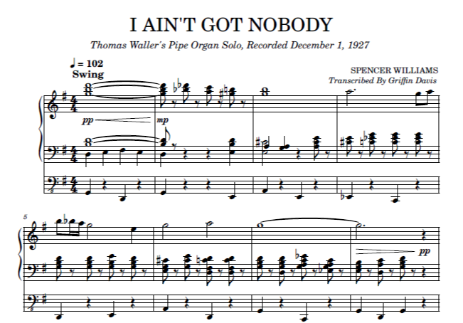 Transcription of Fats Waller's organ solo "I Ain't Got Nobody," recorded on December 1, 1927.