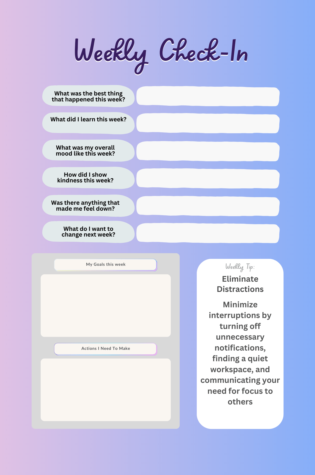 ✅ Weekly Check-Ins – Reflect on wins, struggles, moods, and lessons learned. Build self-awareness that fuels growth.