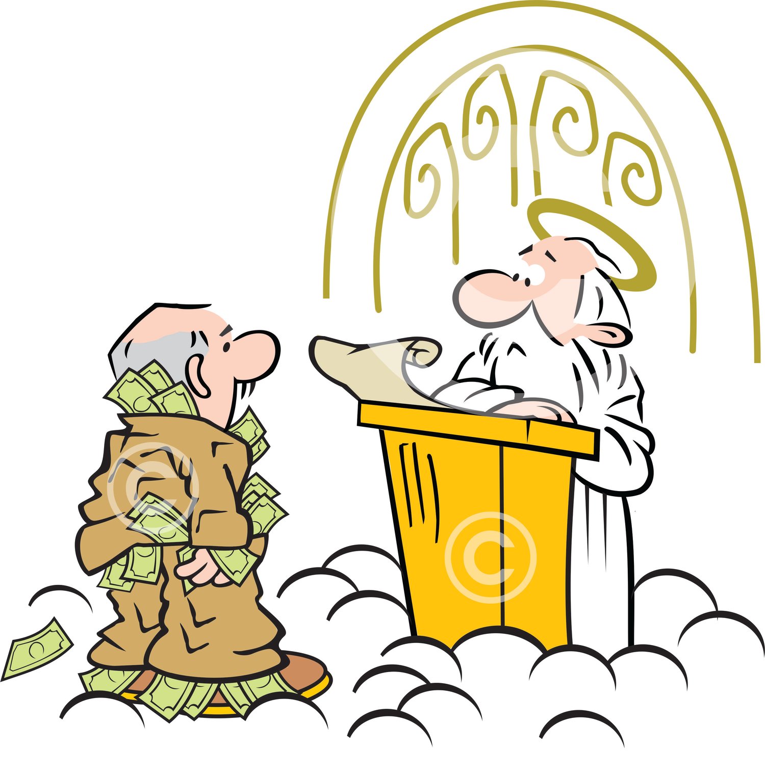 Cartoon man with money stuffed in his clothes being refused entrance at Golden Gate