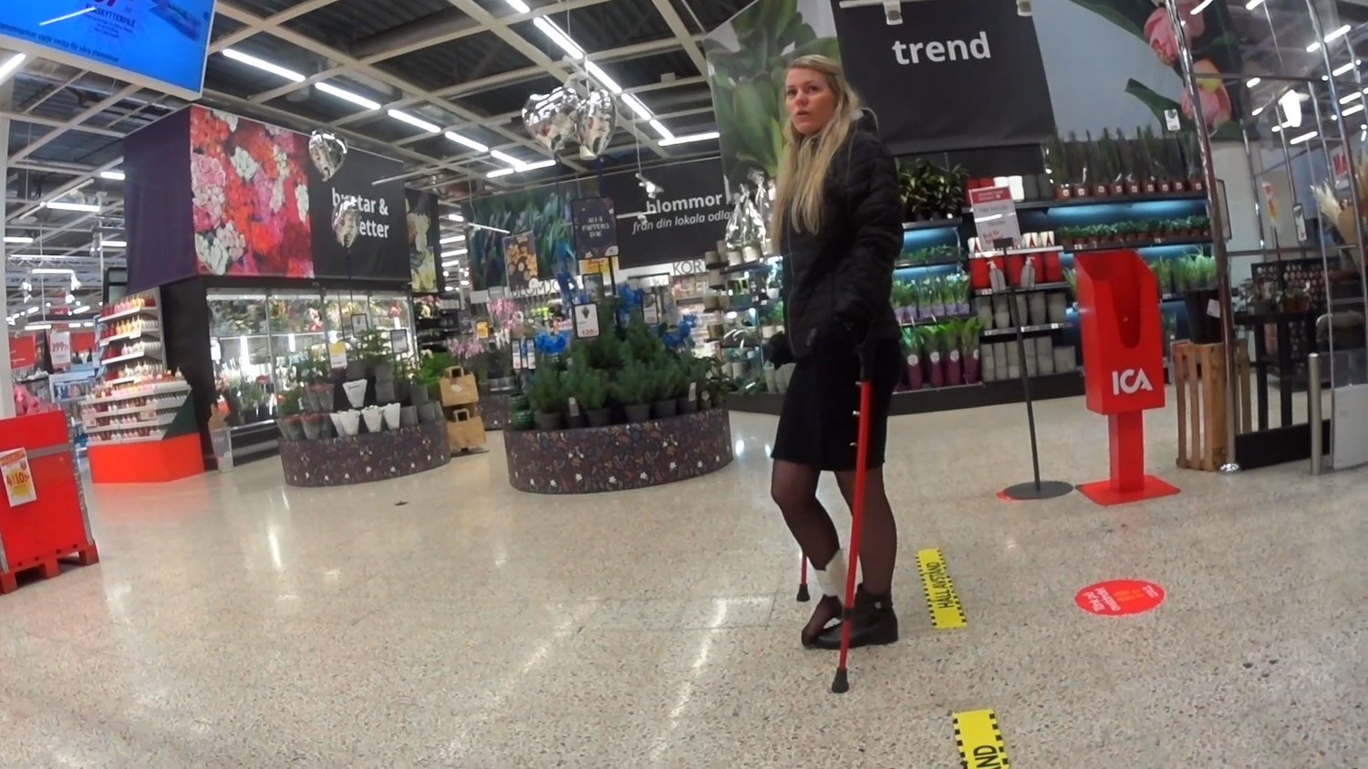 Ice has sprained her ankle and is today crutching in to a store with a black skirt, black thin nylons, a boot on her left foot and a aircast on her hurt left foot.We follow her when she crutch around in the store unable to walk on her foot.In this clip we get some nice semi closeup when she rest her hurt leg on her boot.