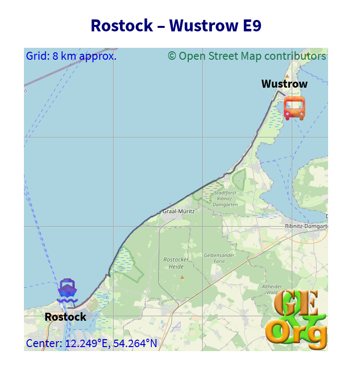 European Long Distance Hiking Path E9, Rostock - Wustrow, one GPX file, one GeoJSON file, one OpenStreetMap.