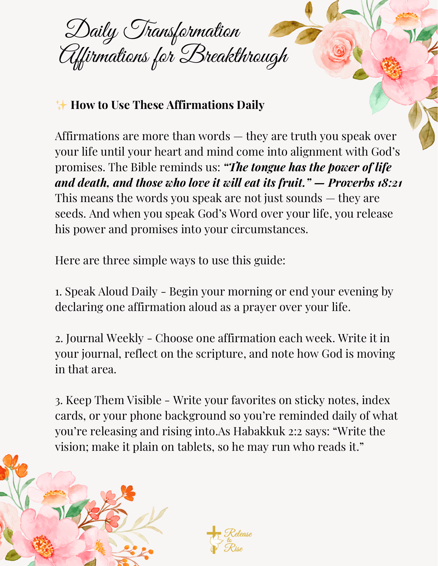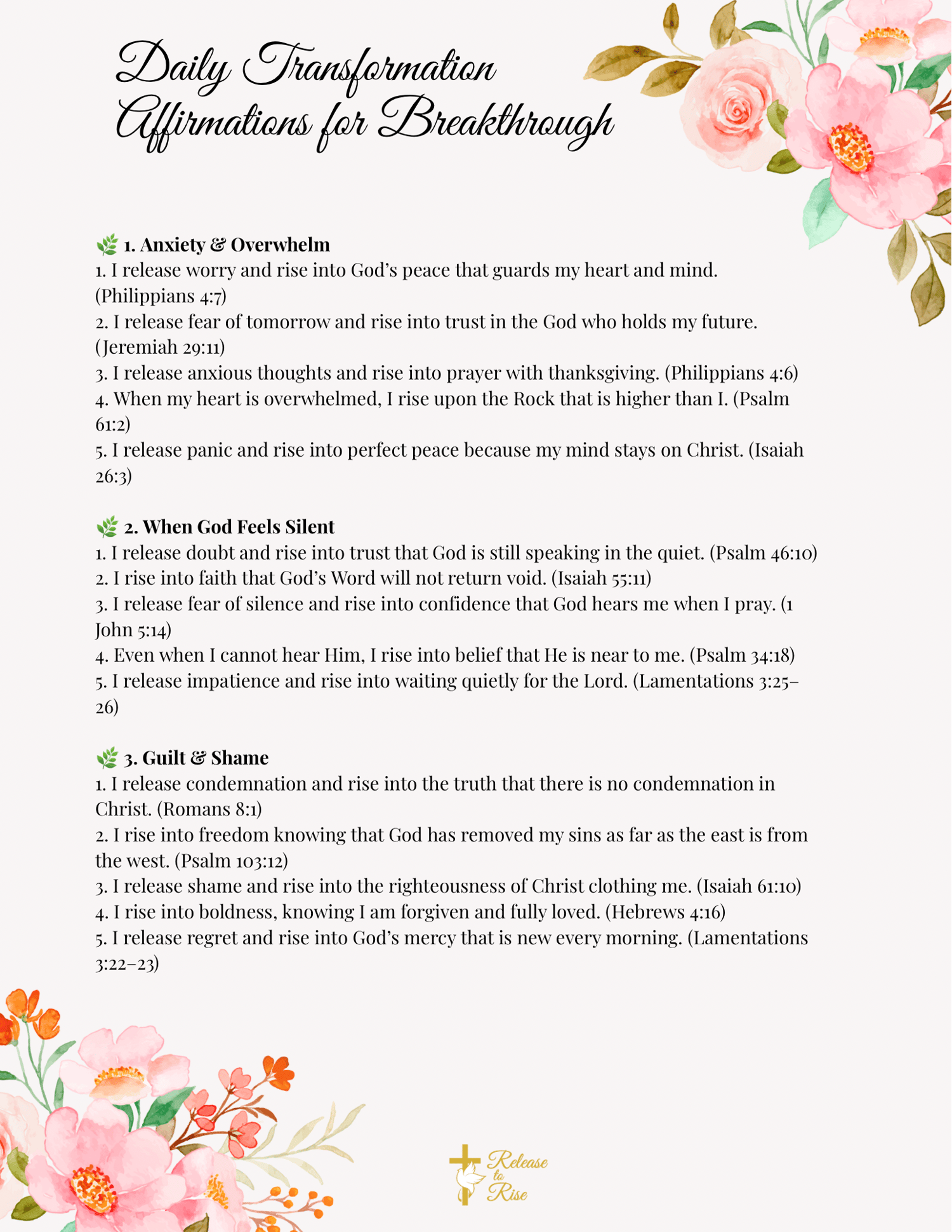Each affirmation is paired with biblical promises for real transformation — not fluff.
