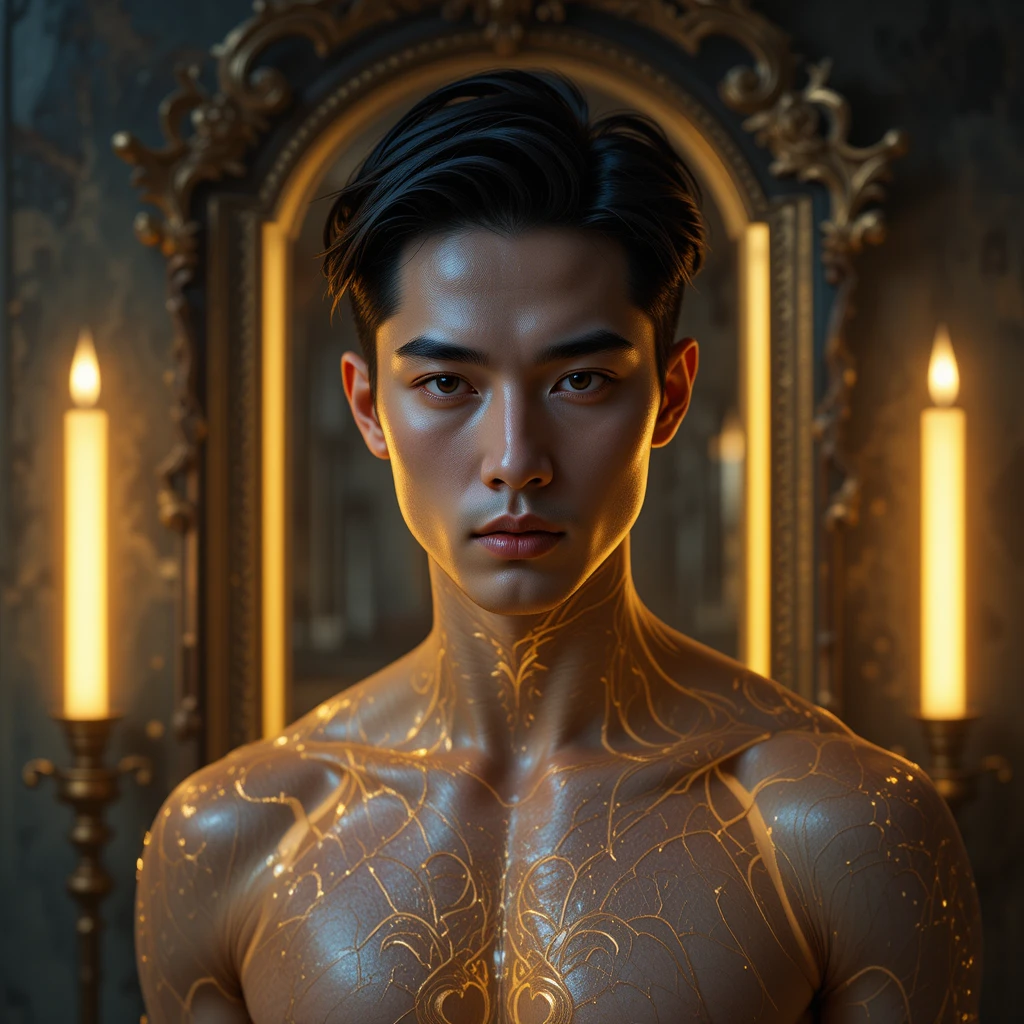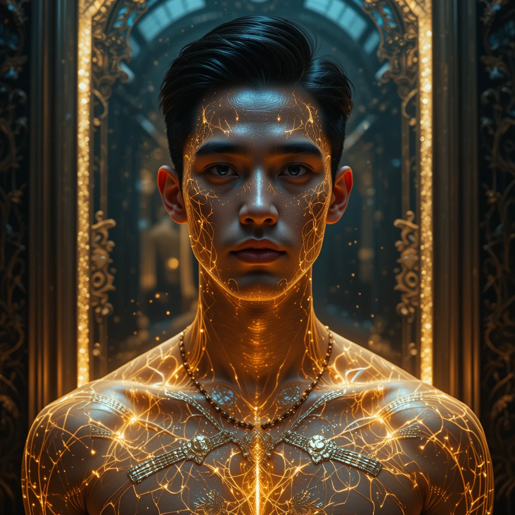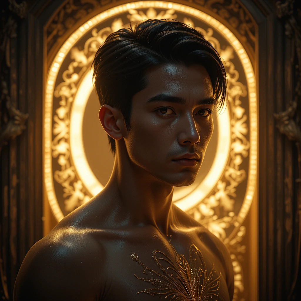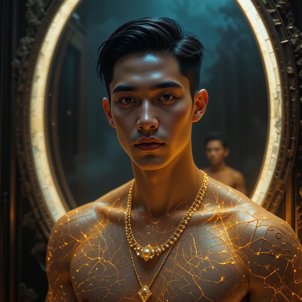 Unyielding Grace is a breathtaking, high-resolution digital artwork created by Æther天神. This piece embodies the serene yet commanding presence of an extremely attractive Latino male figure, rendered with harmonious facial traits, short raven-black hair, and a radiant golden skin tone that glows with unbreakable strength. His skin, inspired by the shadowed power of Lord 阎王, is depicted as indestructible — a living armor of beauty and imperturbability. Standing before an ornate, dimly lit mirror, his calm yet magnetic expression radiates divine authority, enhanced by masterful shadowplay and an atmosphere of mystique.