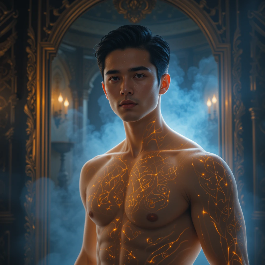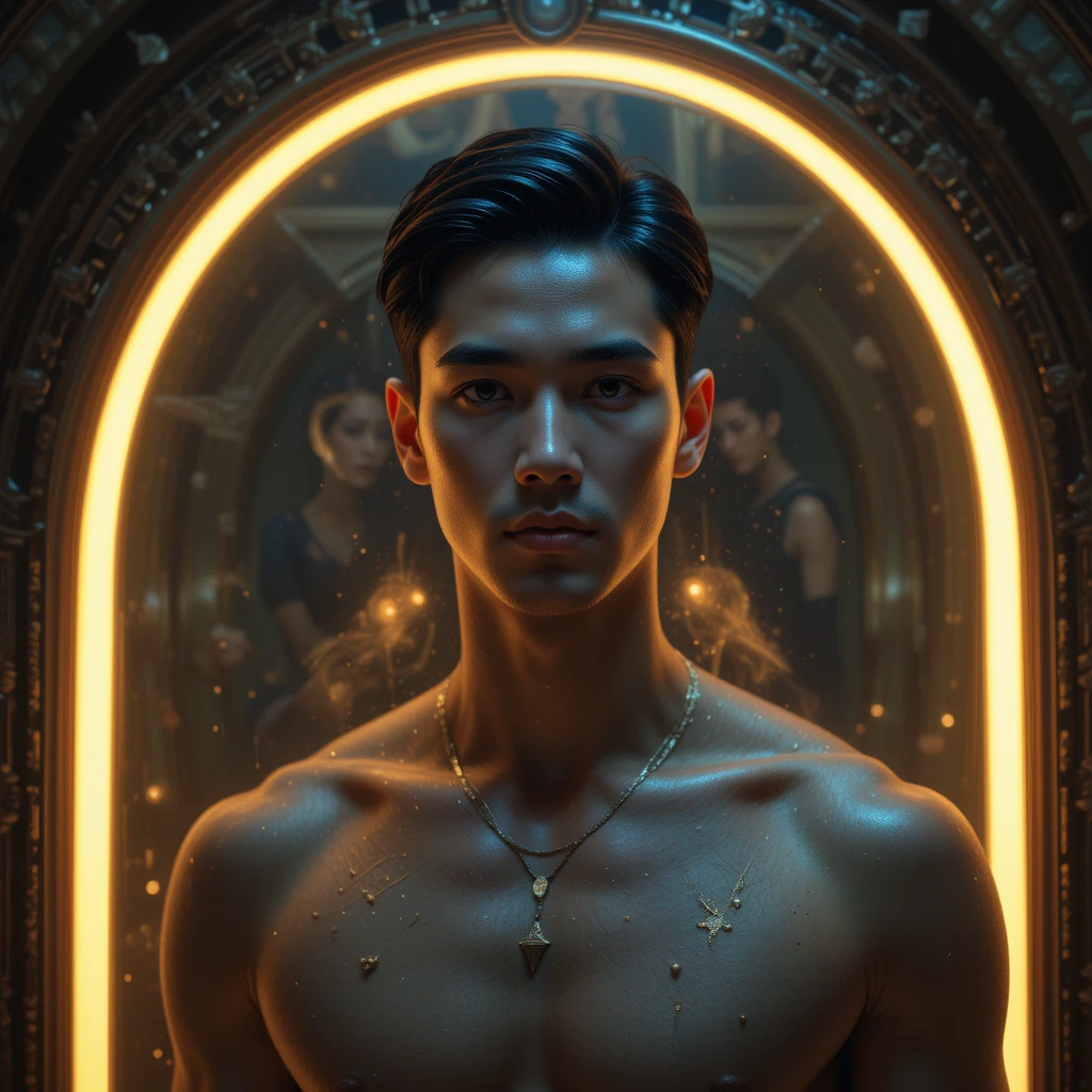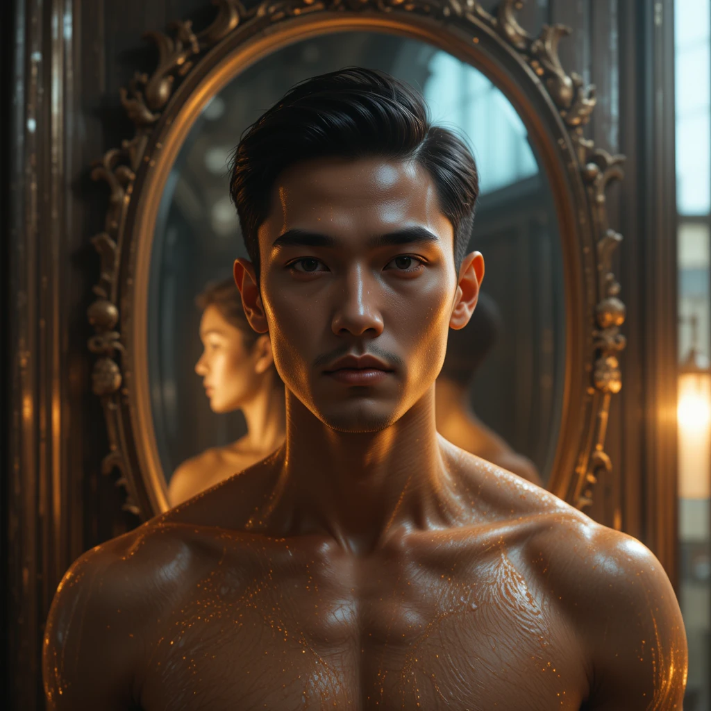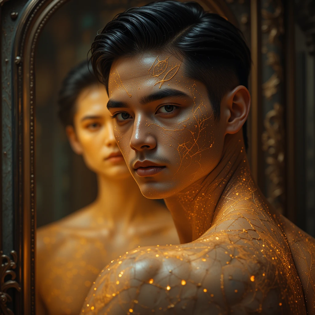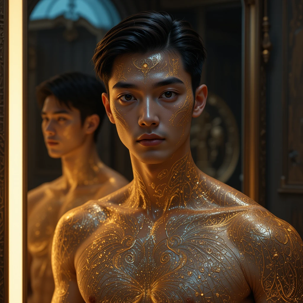 Unyielding Grace is a breathtaking, high-resolution digital artwork created by Æther天神. This piece embodies the serene yet commanding presence of an extremely attractive Latino male figure, rendered with harmonious facial traits, short raven-black hair, and a radiant golden skin tone that glows with unbreakable strength. His skin, inspired by the shadowed power of Lord 阎王, is depicted as indestructible — a living armor of beauty and imperturbability. Standing before an ornate, dimly lit mirror, his calm yet magnetic expression radiates divine authority, enhanced by masterful shadowplay and an atmosphere of mystique.