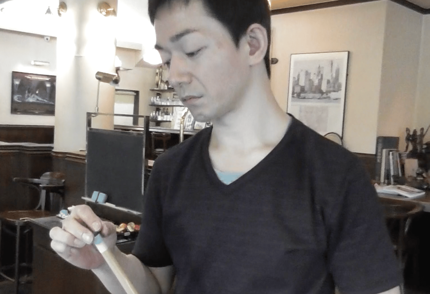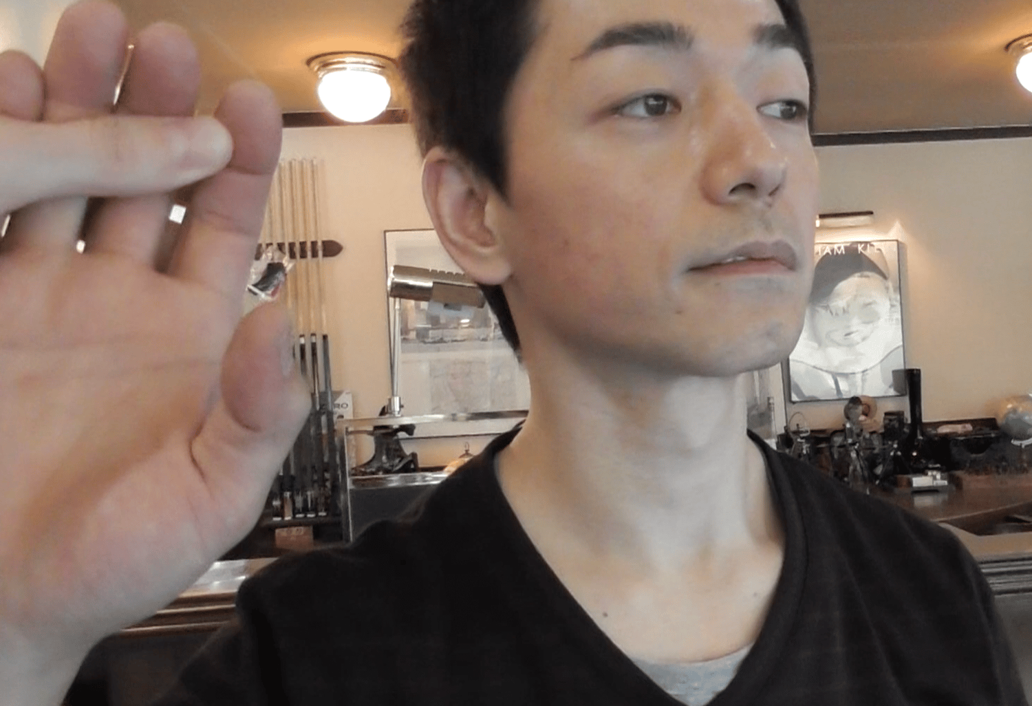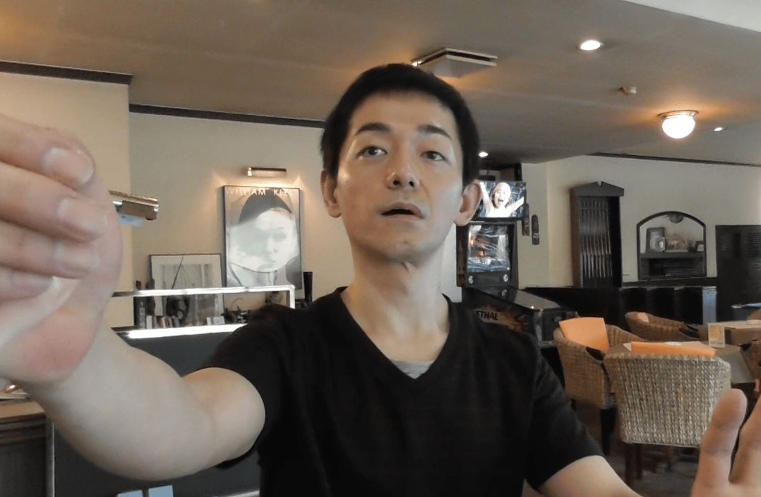 Mr. Yano is playing billiard in an empty salon, and I freeze him many times with a voice command, moving his arms and taking away is pool stick. He is surprised every time.