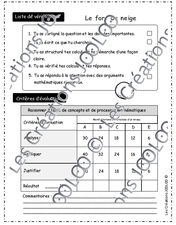 - 1 feuille de vérification pour l'élève incluant une partie pour la pondération par l'enseignant