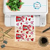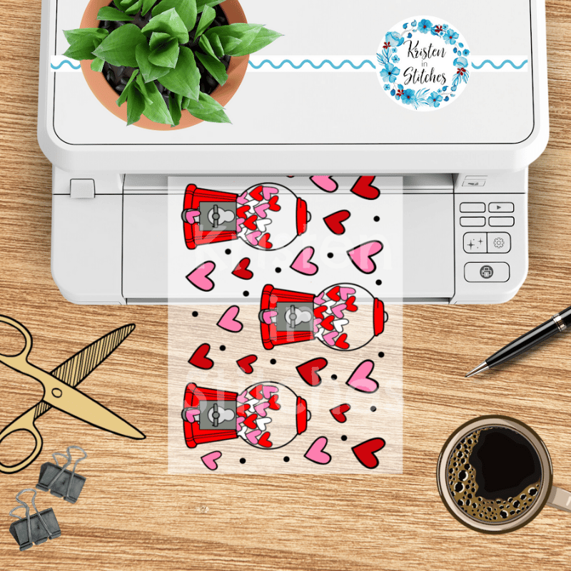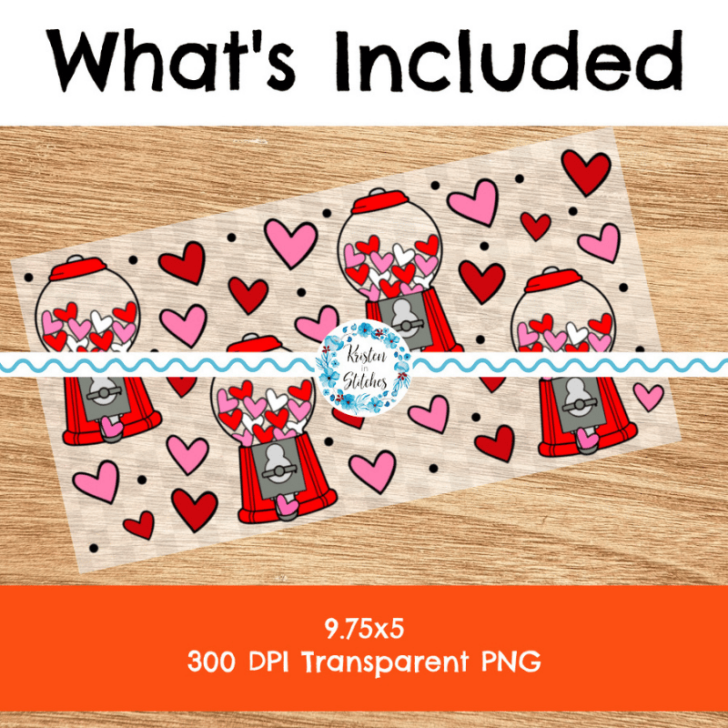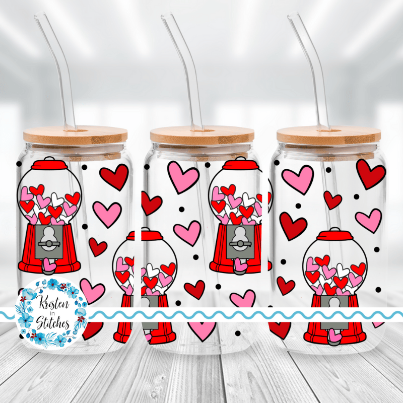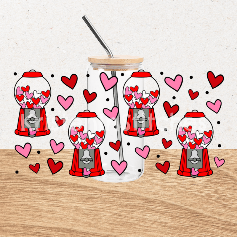 Features cute gumball machines and hearts in red and pink.