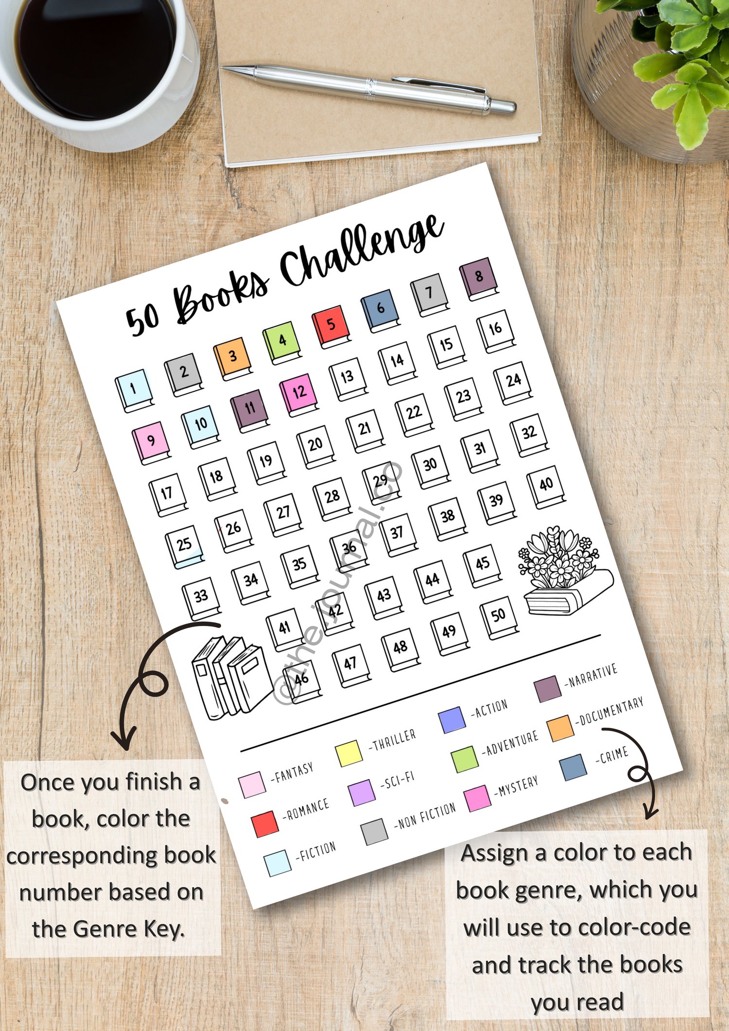 This 50 Books Challenge provides visual motivation to hit your reading goals, while also giving you a clear, colorful overview of your favorite literary genres!