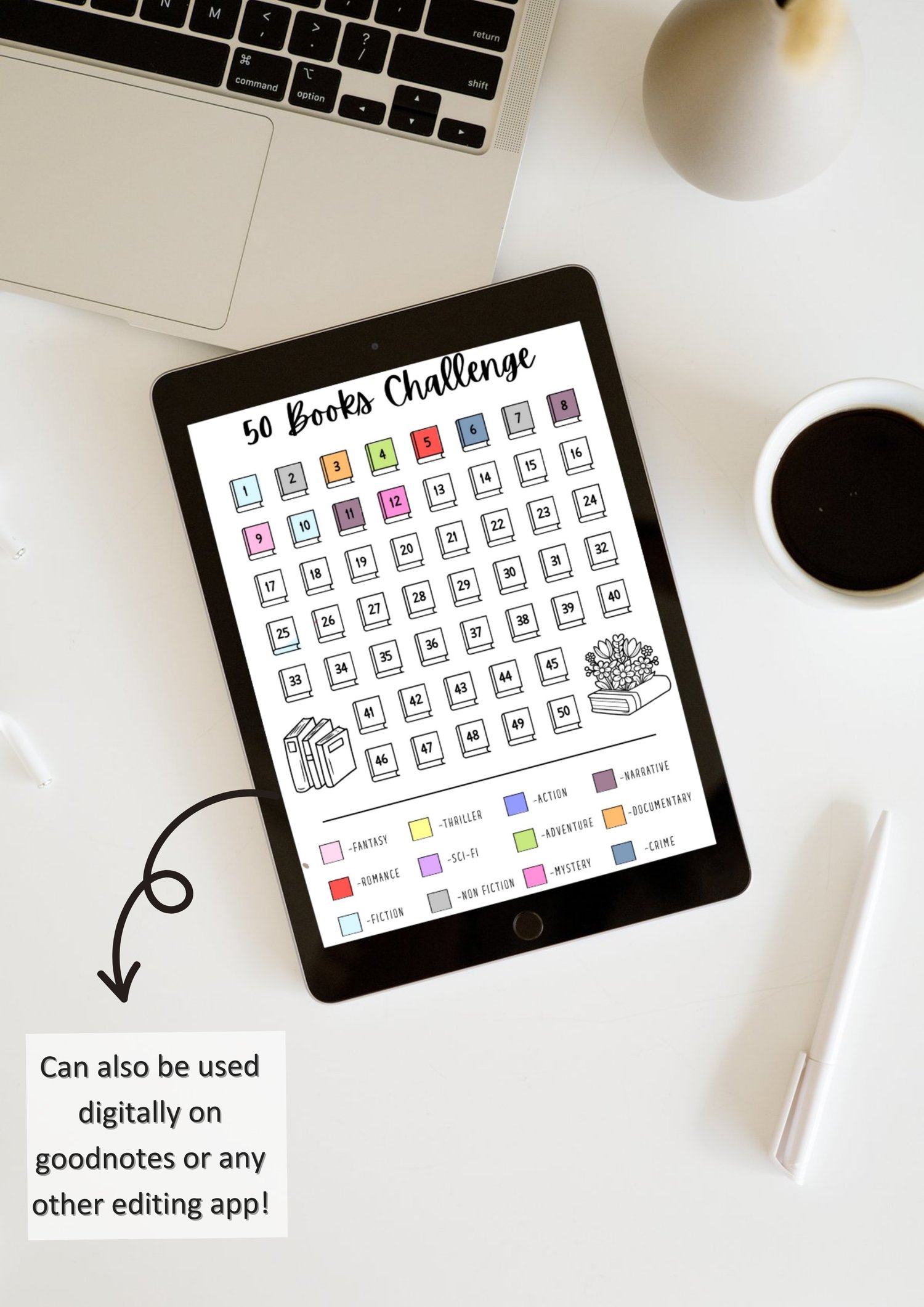 The tracker features 50 numbered books representing each book you read. Once a book is finished, you color in the corresponding book based on the genre legend. You receive two versions with this download: one with pre-filled genres (Fantasy, Thriller, Romance, Sci-Fi, etc.) and one blank version for you to write your own custom genres. Since this is an instant digital download, you can print this challenge as many times as you need for every 50-book goal you set! Use digitally in GoodNotes or print for a motivating physical record.