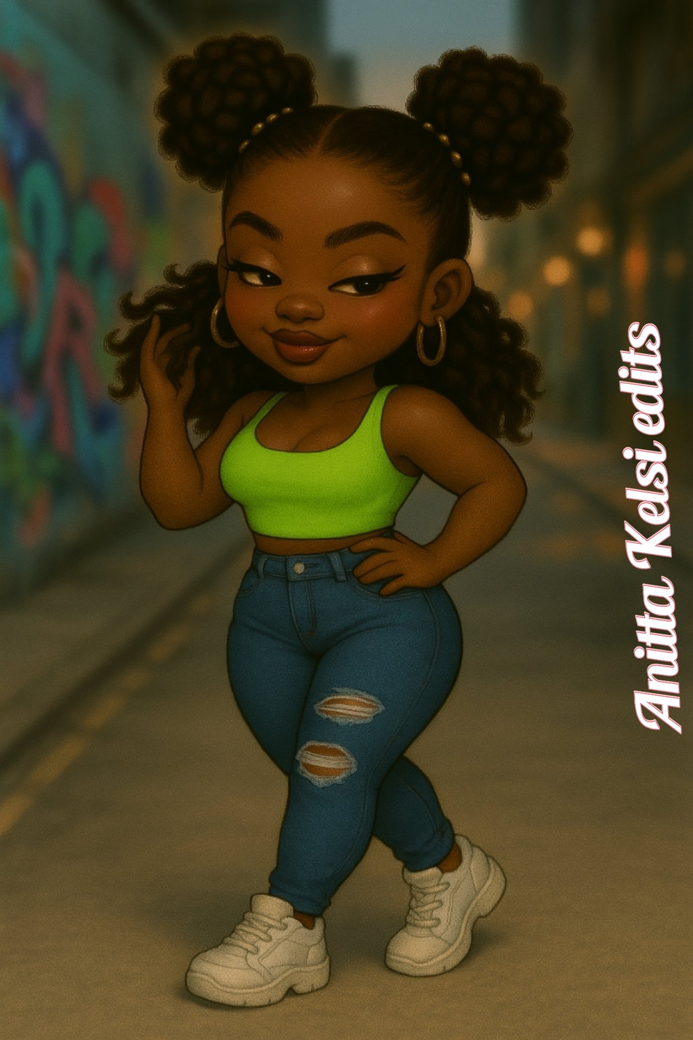 Step into the world of Anitta Kelsi Edits, where melanin-rich chibi characters slay with style, attitude, and unapologetic flair. Each piece is a celebration of curves, culture, and confidence — from streetwear icons to glam goddesses.