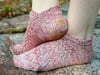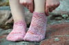 Knit from the toe up, Rose Quartz Shorties are worked in a delicate and airy lace pattern that's perfect for summery socks. The socks feature a reinforced heel flap that provides durability and cushioned comfort whether you wear the socks with or without shoes. An optional short-row heel tab at the back leg adds extra functionality, preventing slippage and keeping the socks in place. A short twisted-rib cuff completes the design, giving the socks a polished look.