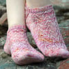Rose Quartz Shorties are quick-to-knit, ankle-length sneaker socks you can whip out of less than a skein of fingering-weight sock yarn. The sharp angles of the lace pattern bring to mind the jagged edges of the unhewn gemstone the socks are named after.