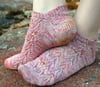 Rose Quartz Shorties come in three sizes (58, 66, and 74 stitches) with adjustable foot length. Right and left socks are identical and can be worked two-at-a-time. The pattern is written with both metric and US terminology. Both written and charted instructions are provided, allowing you to choose your preferred method of following the lace pattern.