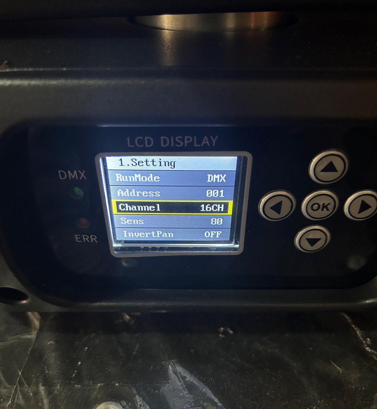 * Verifique, con un Fixture de pruebas (click), que coincidan estos canales: 1 Dimmer, 2 Strobo, 8 en el valor 20 = Verde, 9 en el valor 50 = Gobo de tres círculos, 10 Prisma 1, 14 Foco (ver tercer foto).