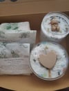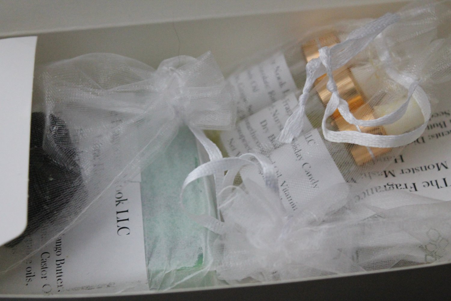 Each box will include a 2-ounce dry body oil, a 6-ounce jar or bottle of bath/shower salts, and 4 soaps ranging from 2 - 4.5 ounces.