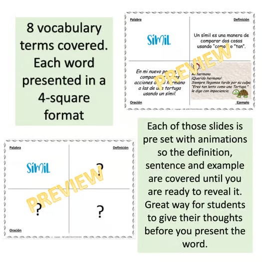 Este recurso incluye una presentación de 30 diapositivas para enseñar y practicar símil, metáfora, modismo, hipérbole, personificación, onomatopeya, aliteración e imágenes sensoriales.