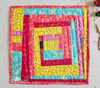 Improv pieced wonky log cabin in pink, yellow and aqua.