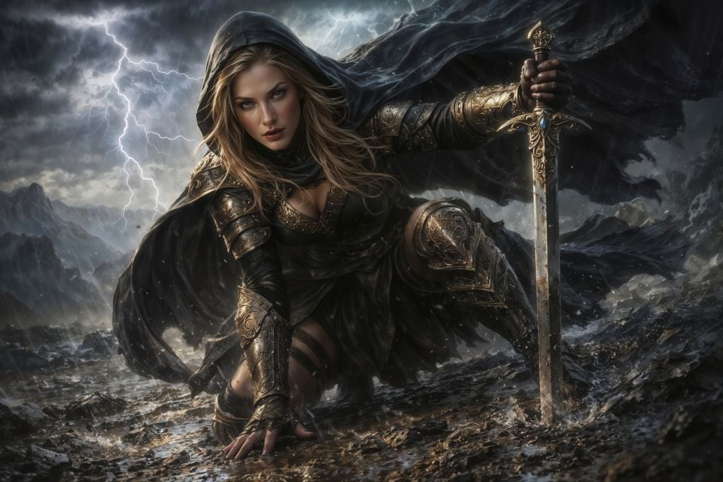 Lightning splits the sky. Rain turns earth to iron-black mud. And in the heart of it all, she kneels—cloak whipping like a banner—one hand to the ground, the other locked on a gilded sword as if the storm itself swore loyalty first.