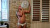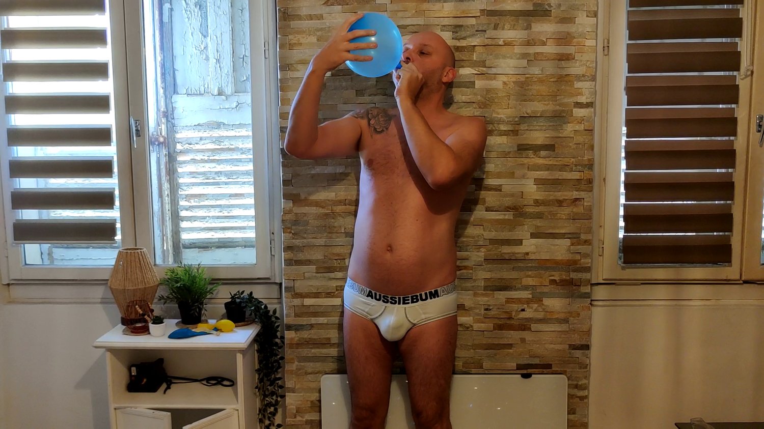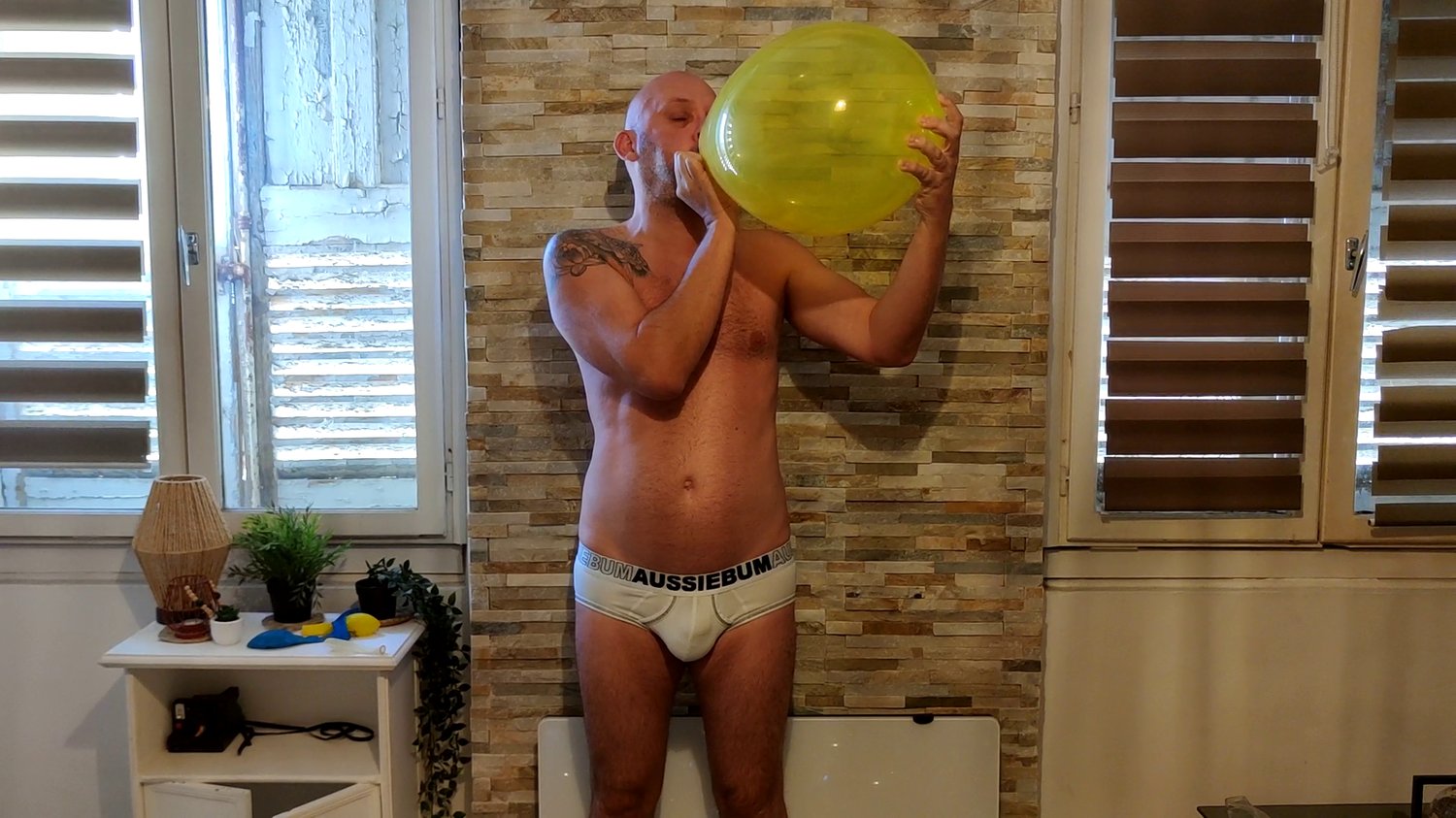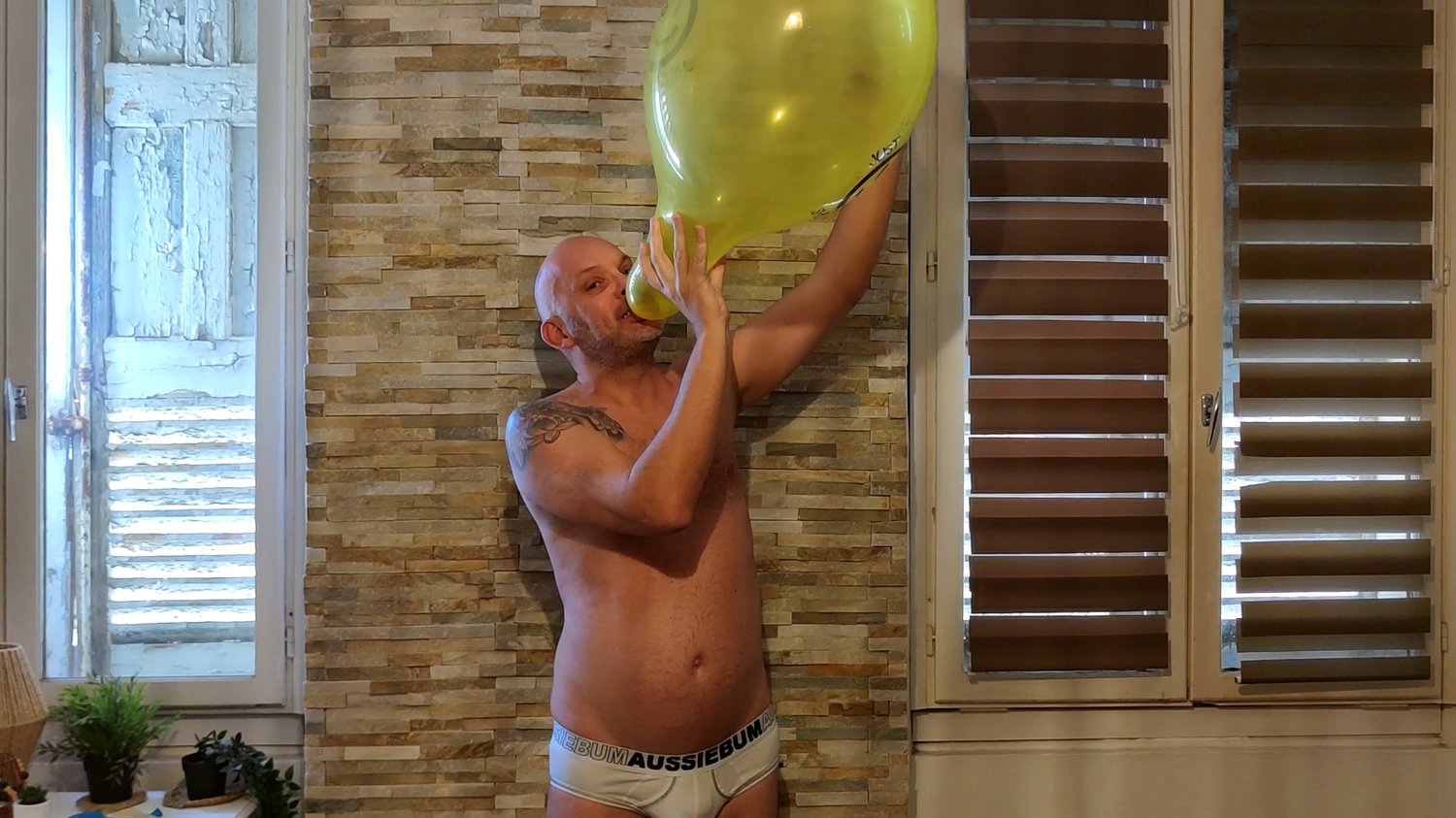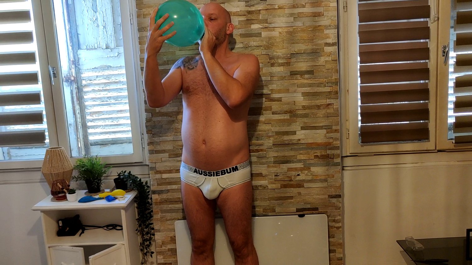 In this video Laurent blow 6 balloons and burst them with his hands or a knife.