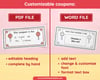The PDF file includes blank coupons with editable headings for you to print and write on by hand. There is also a Word document which you can use to create completely customizable coupons! With the Word files, you can change the font, font colour and format the text boxes however you wish. You can use the coupons as a way to reward your students, or invite children to complete the coupons to give to friends or loved ones.