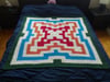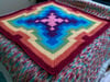 A mid-size blanket from the “Eventually Granny Square” series, this design was inspired by stars. The idea for the colours came from this Minute Physics video.