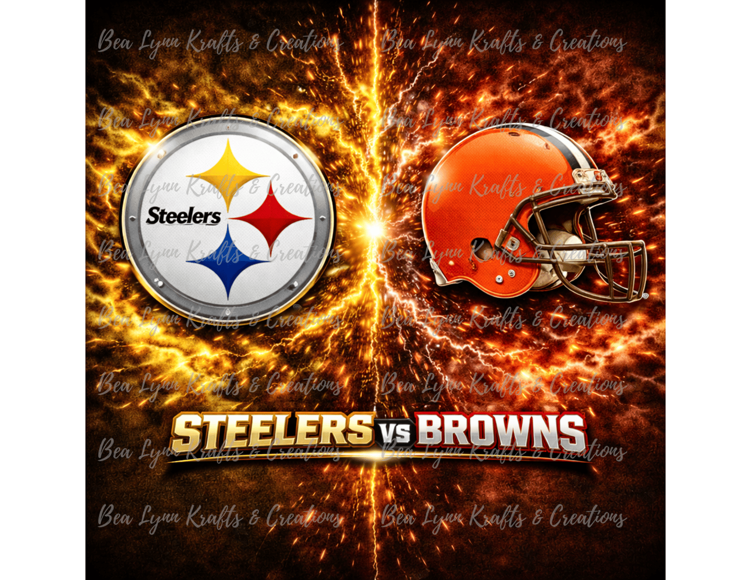 High-resolution Steelers vs Browns matchup PNG featuring a fiery gold-and-orange split lightning design. Perfect transparent PNG for sublimation, shirts, tumblers, stickers, and game-day crafts. Ideal for rivalry merch and football fan creations.