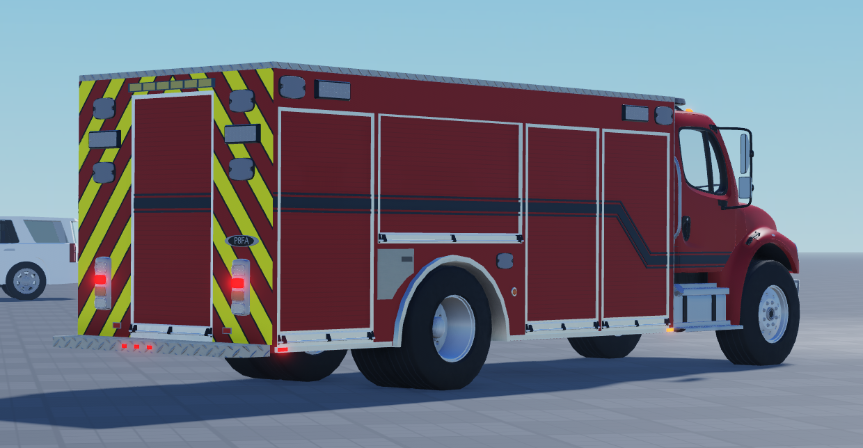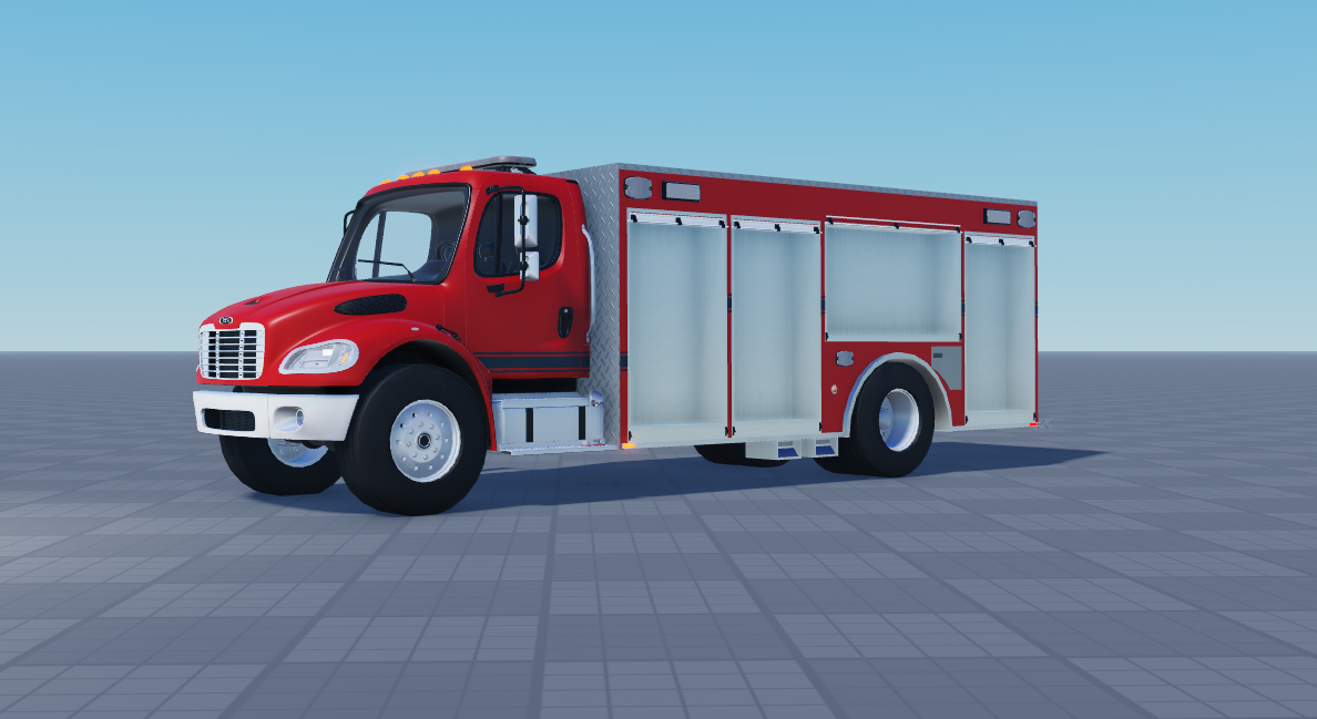 This truck is a P8 Fire Apparatus Stock 2019 Pierce/Freightliner Light Rescue. The vehicle is completely handmade using parts aside from the cab. All the features work on the vehicle including the doors and compartments. The truck is on Firestone chassis and does not have a UVMAP. Recolor of the apparatus or striping will have to be done by hand.