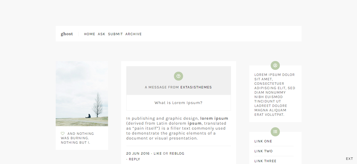 features: 200x250px sidebar image, blog title, blog subtitle, three custom links, 400px text posts