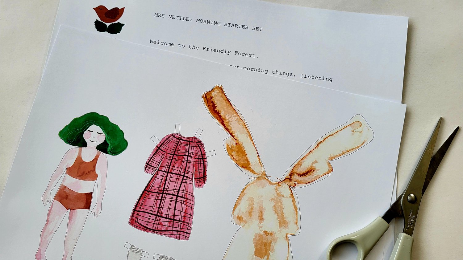 A gentle printable set from the Friendly Forest, featuring Mrs Nettle and her morning things. Includes a two-page PDF with a short introduction and one printable sheet for home printing, cutting, and quiet little moments of play. Inside you will find Mrs Nettle, her sleepwear, dressing gown and bed socks.