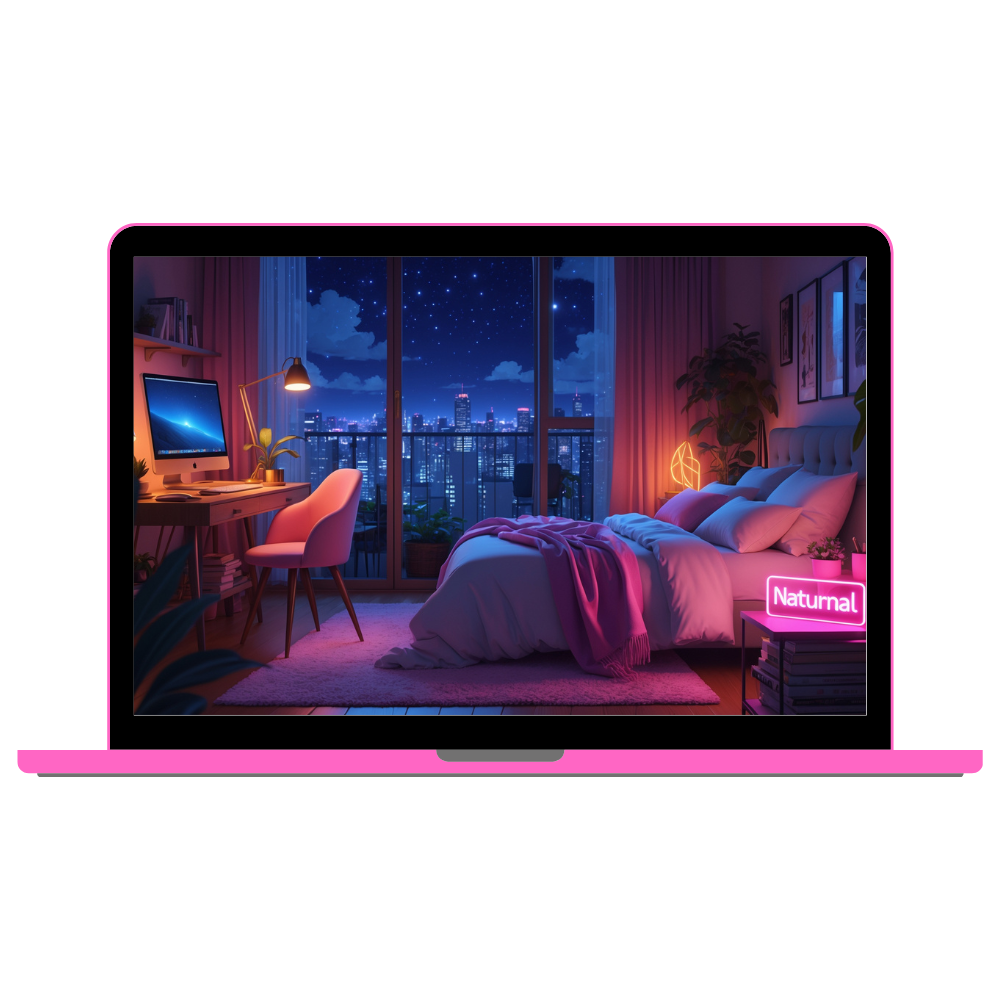 "A Night At Home" is a depiction of my dream bedroom space illuminated subtly by a custom Naturnal neon sign.