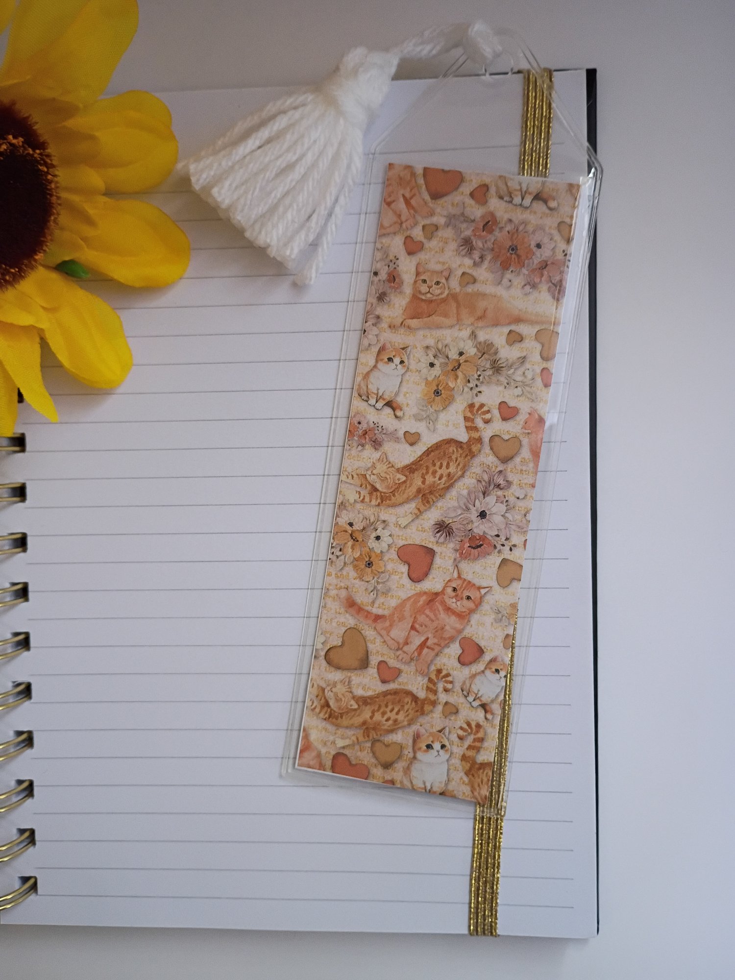 These bookmarks have a different design and pattern on the front and back, with the cat design on the front. They are made from upcycled scrapbook paper and attached to 170 lb. weight cardstock paper for extra stability and firmness.