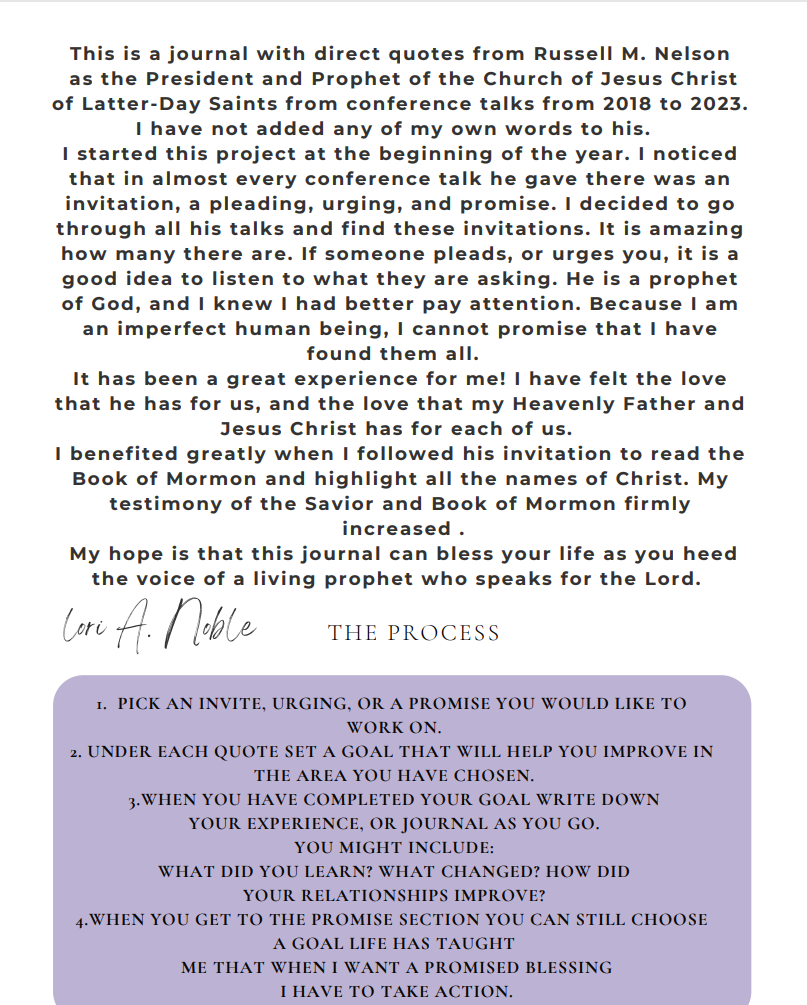 This has talks up to October 2023. This is a journal of President Russell M. Nelson's invitations, pleadings, urgings and promises. I went through all his conference talks since he become the President of the Church of Jesus Christ of Latter-Day Saints. This has been a labor of love project. I hope you will enjoy this and have an