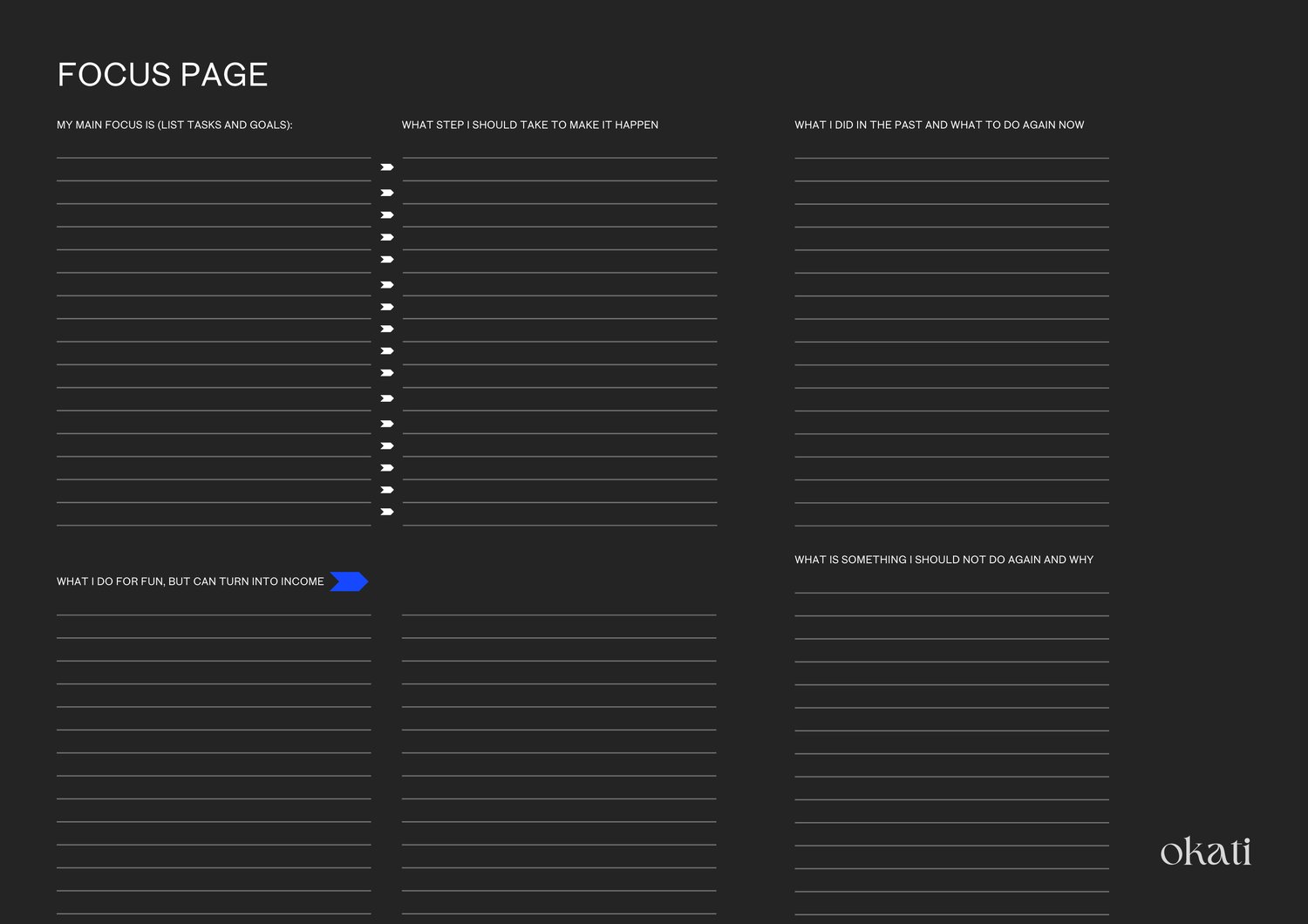 he FOCUS ON digital planner by Okati helps you stay on track and achieve your goals. Whether you use it on your device or print it out, this planner will help you define your goals, set a growth mindset, reduce distractions, understand personal values and stay focused, consistent on your goals. It includes a monthly calendar, a weekly time planner, focus pages, priority wheel, IKIGAI and motivational graphics to keep you inspired to get your tasks done and reach your goals.