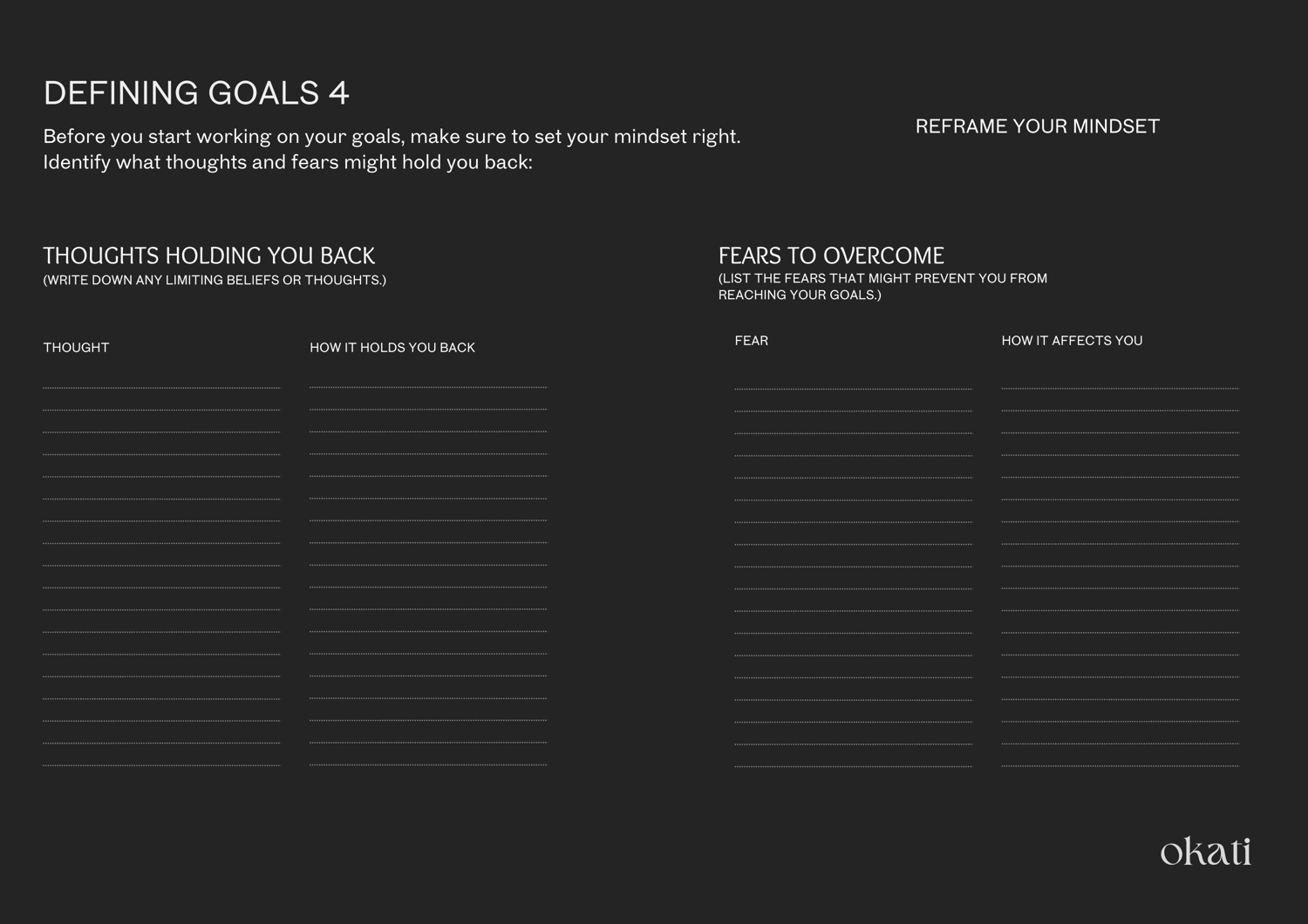- Mindset and Anxiety Pages: Reframe your mindset and manage anxiety.