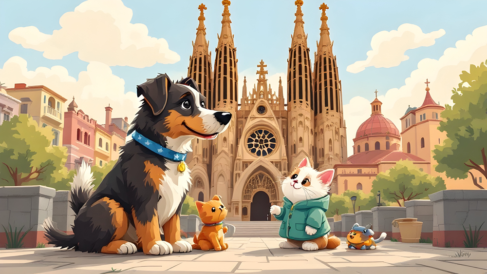 A dog and a cat enjoying their toys together in front of Sagrada Família, capturing a beautiful moment of companionship.
