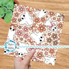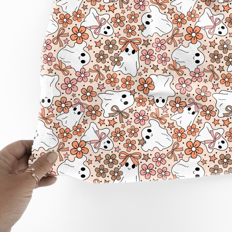 Friendly ghosts with ribbon bows and daisy flowers in neutral boho colors, pink and tan.