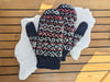 The pattern requires approximately 185 m / 200 yards of worsted weight wool in three colours: