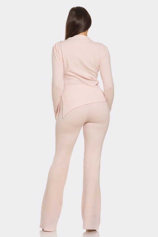 Elevate your everyday style with this chic two-piece set designed for comfort and sophistication. The brushed ribbed fabric offers a soft, stretchy feel, while the mock neck and pleated shoulders add a refined touch. An asymmetric side-ruched hem with slit detail creates a flattering silhouette, perfectly paired with elastic waistband flare pants for effortless movement.