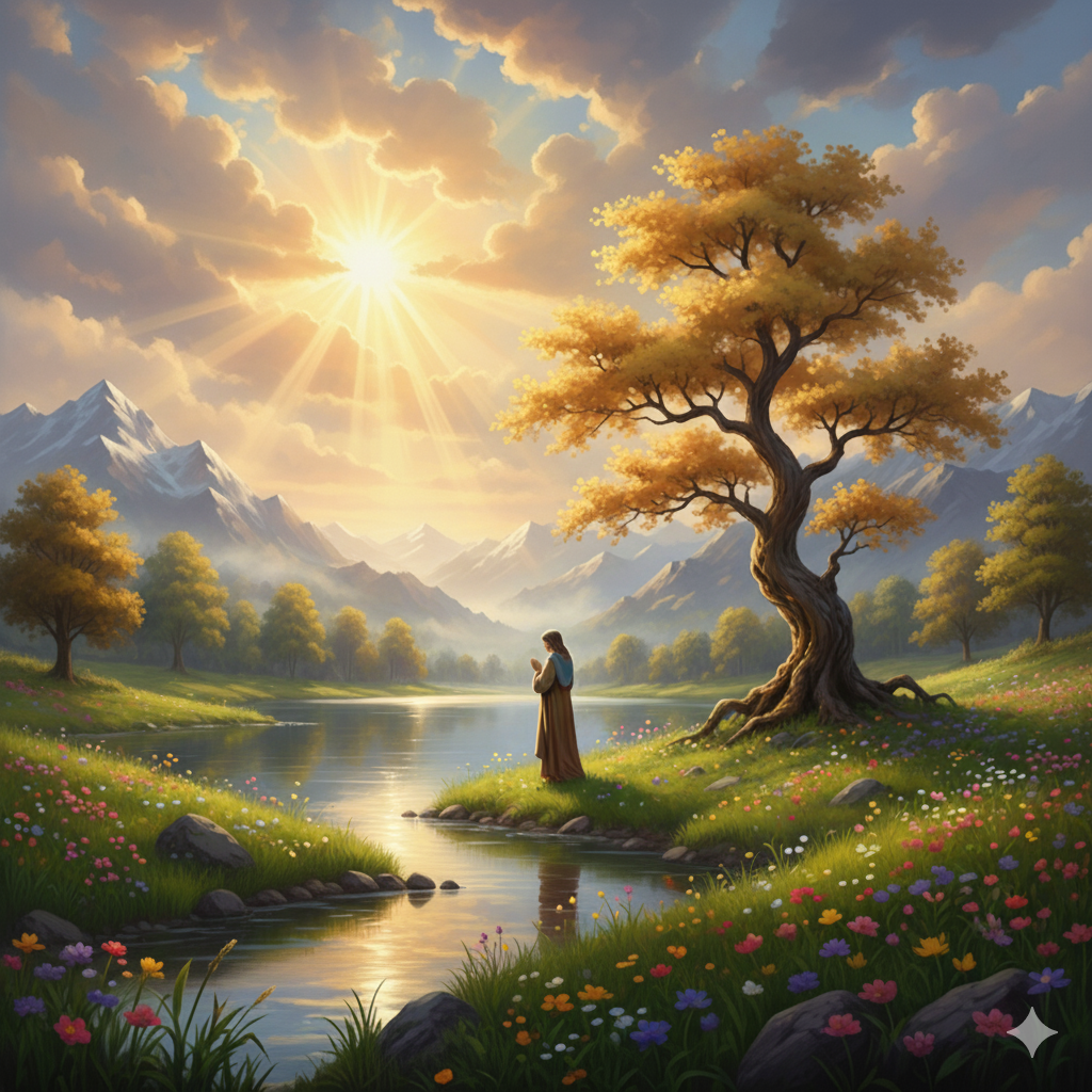 a beautiful, spiritually inspiring scene showing rays of golden sunlight breaking through soft clouds over a peaceful landscape — symbolizing divine presence and hope. A figure stands in quiet prayer or reflection near calm waters, surrounded by nature that glows with heavenly light.