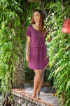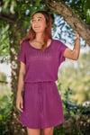 Enjoy summer days in this dress. It features drops shoulders, shaped with short rows, and a blouse effect with a gathered waist with a crochet cord. The bamboo yarn has just the perfect drape and makes this a light and elegant dress. You can style it for a walk in the park on for an evening out.