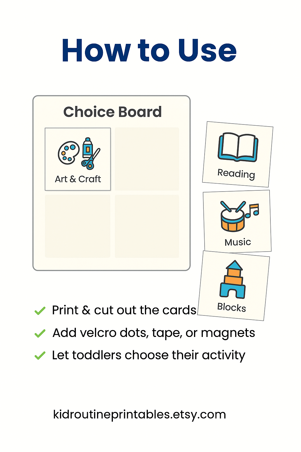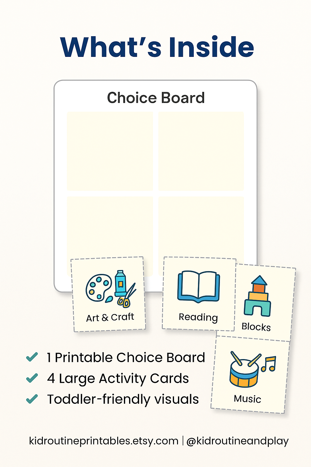 ✔ 4 large activity cards – Art & Craft, Reading, Music, and Blocks