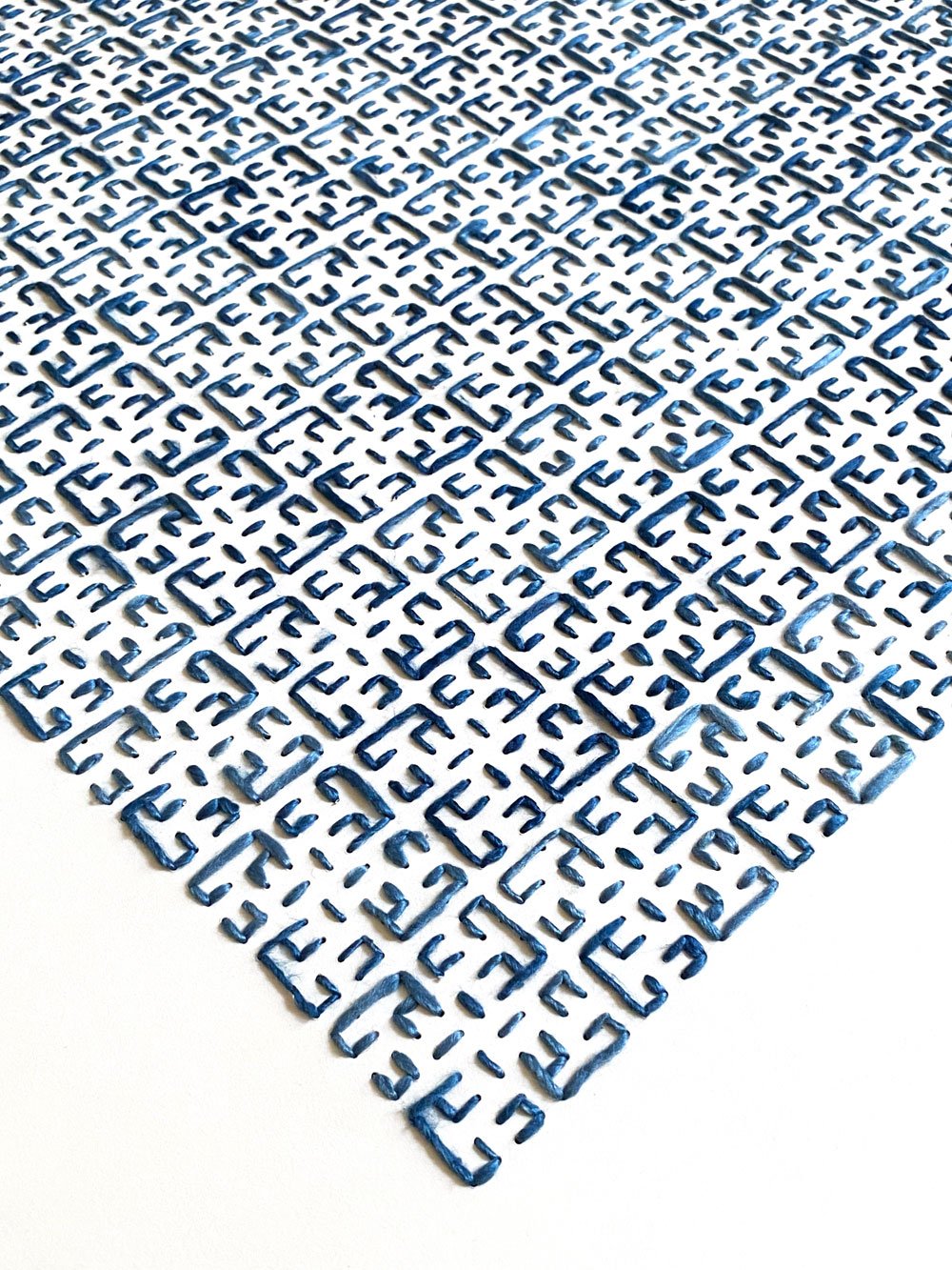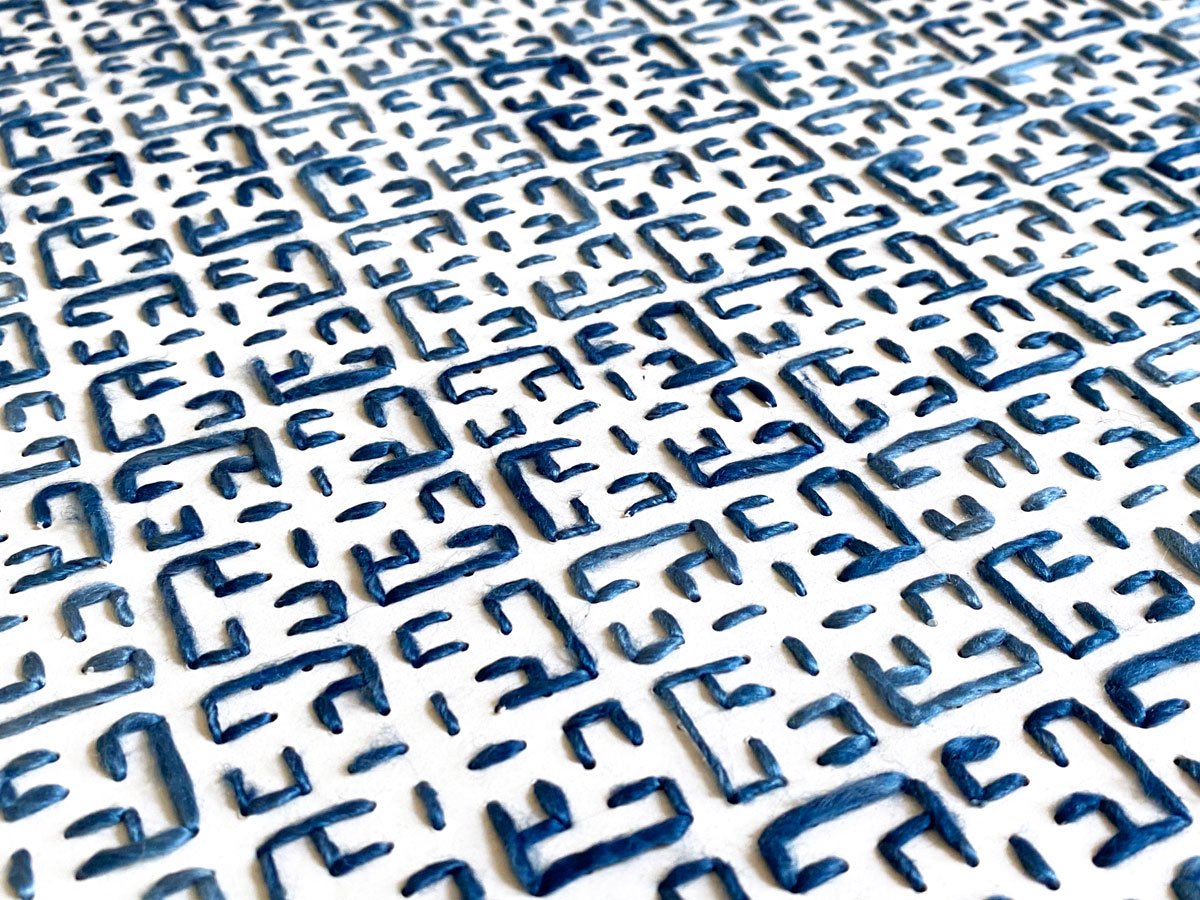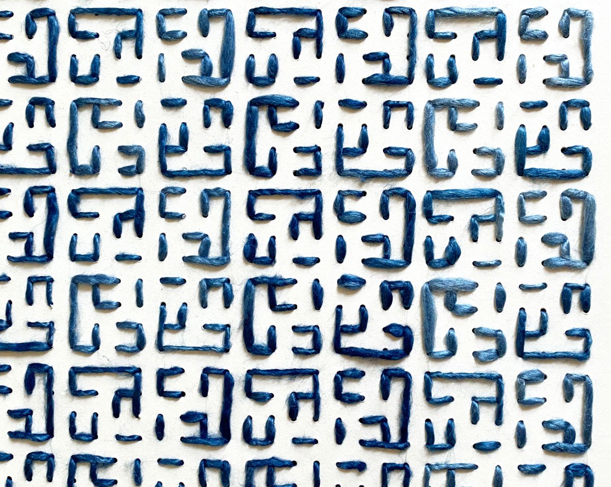 Kibisu combed silk, hand-dyed with indigo, stitched on paper, 55x55 cm.