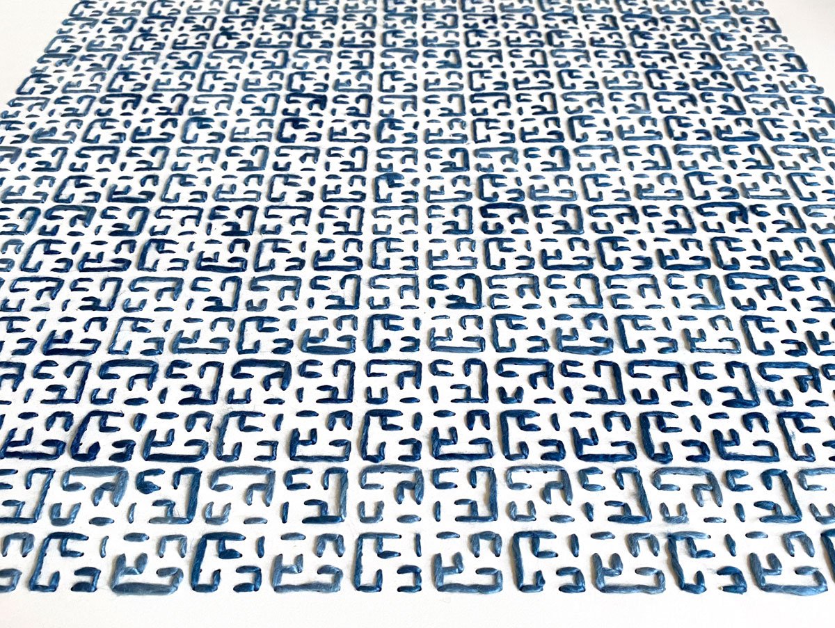 A stylised form of the word حداد (Ḥidād, Mourning) is here repeated 324 times – or 325, once you notice that they assemble to create a larger version of themselves. For a while now I’ve been feeling like the seemingly endless, daily feed of losses is adding up to a huge background of grieving that is always there, regardless of the joy of individual moments.