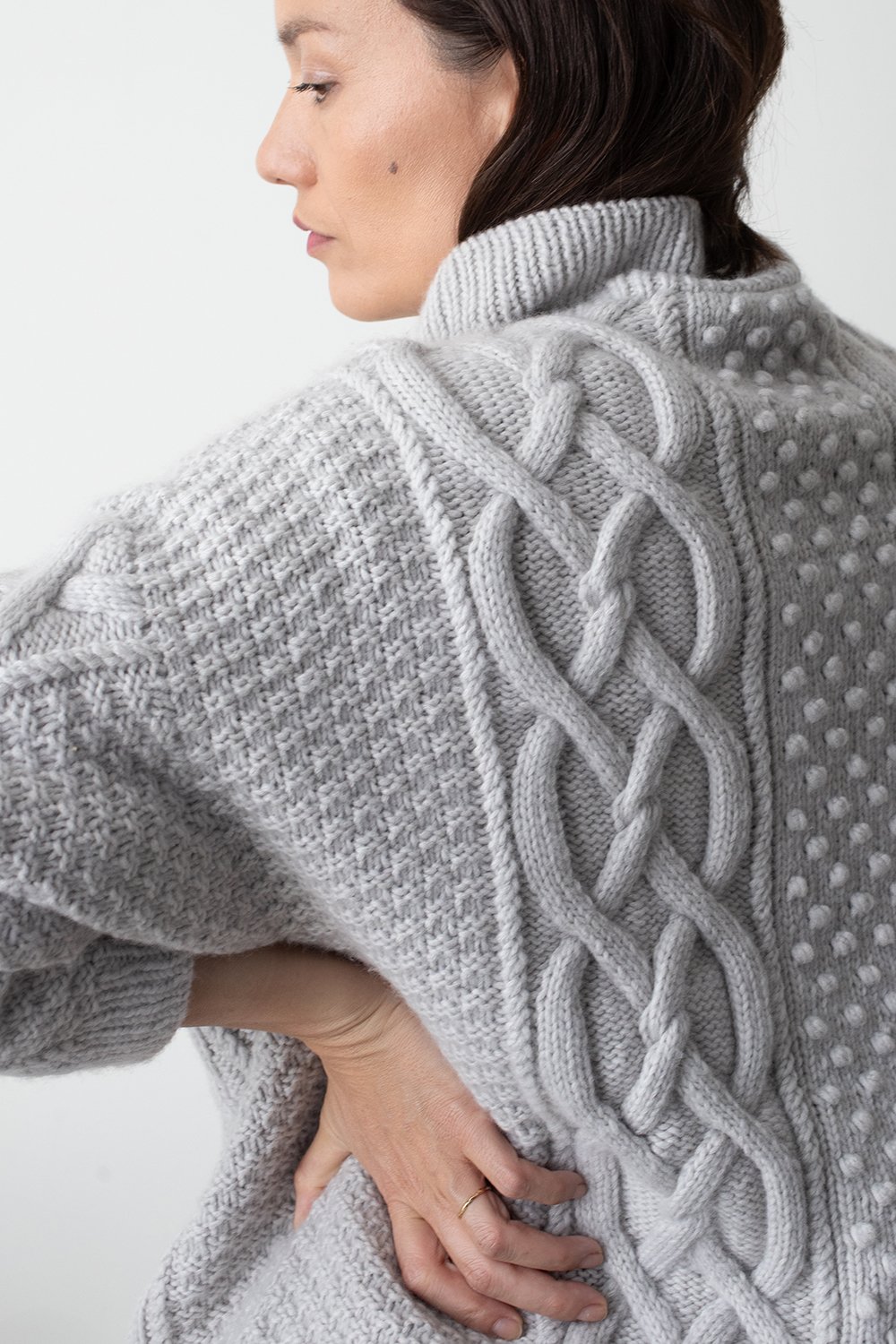 The Burnside Sweater is a close cousin to my previous cabled cardigan, Sitka and Spruce. Featuring bold, wide cables and striking bobble panels, this design is one you’ll find yourself reaching for again and again.