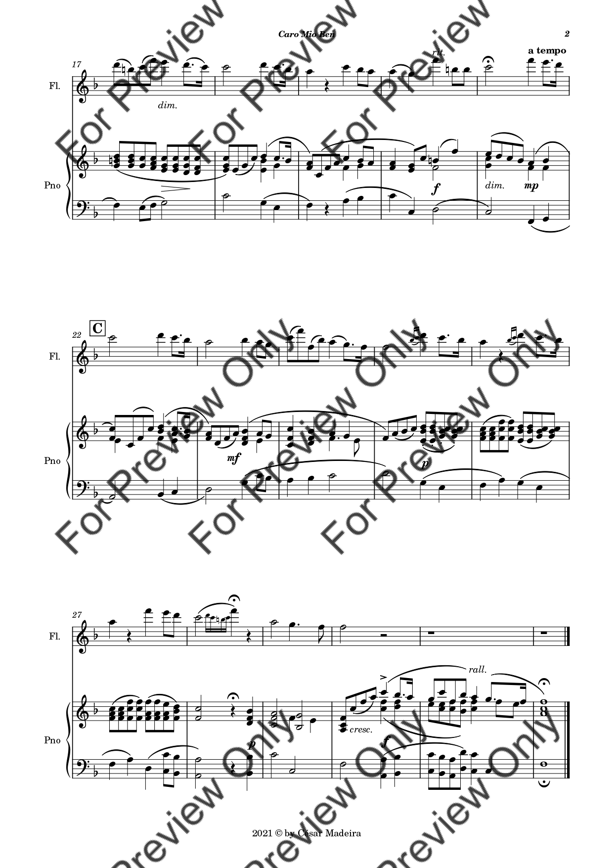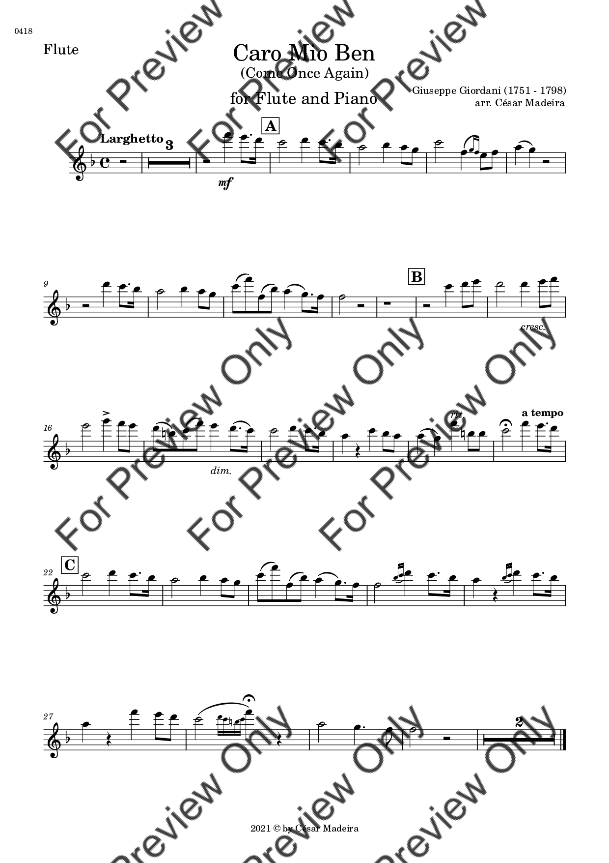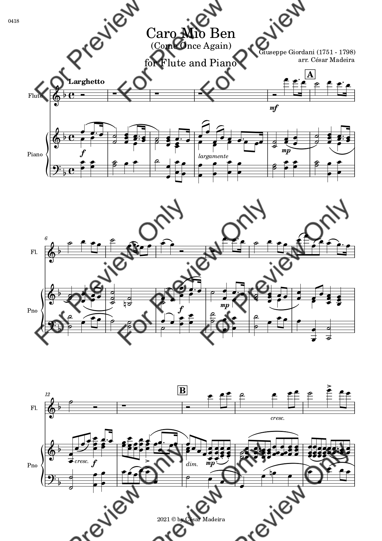 Caro Mio Ben (Come Once Again) by Giuseppe Giordani. Arrangement for Flute and Piano. With Full Score and Individual Parts. Have fun!