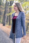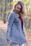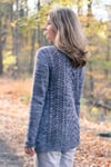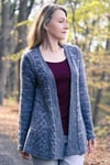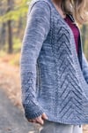 Mesh and eyelet lace columns highlight expanding lace panels inspired by the wings of soaring birds, making a flowing cardigan with a swing shape. Worked seamlessly from the top down, minimal shaping and simple lace textures make an easy to knit sweater that flatters a wide range of sizes.