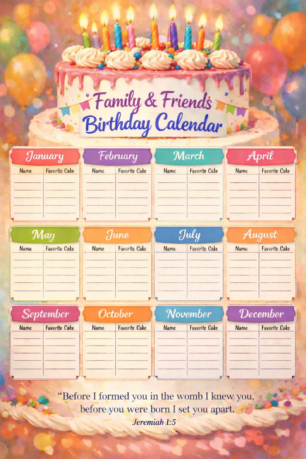 This elegant, faith-inspired calendar features a warm, joyful design with a celebratory cake illustration and a meaningful scripture reminder, making it both functional and uplifting. Perfect for kitchens, refrigerators, home offices, command centers, or gift giving.