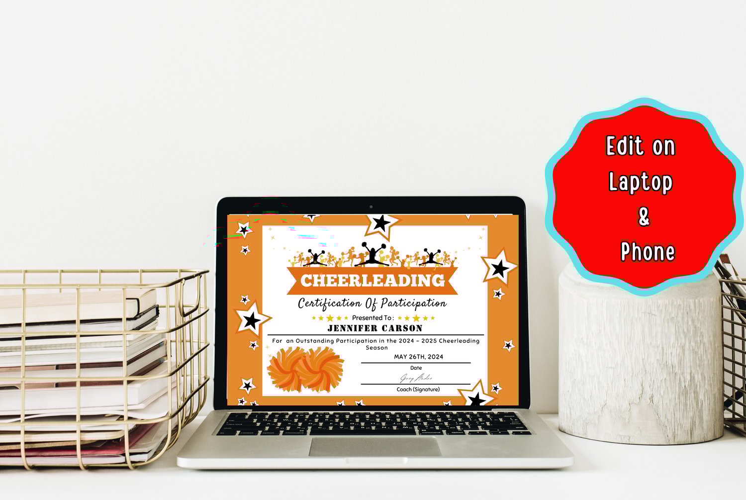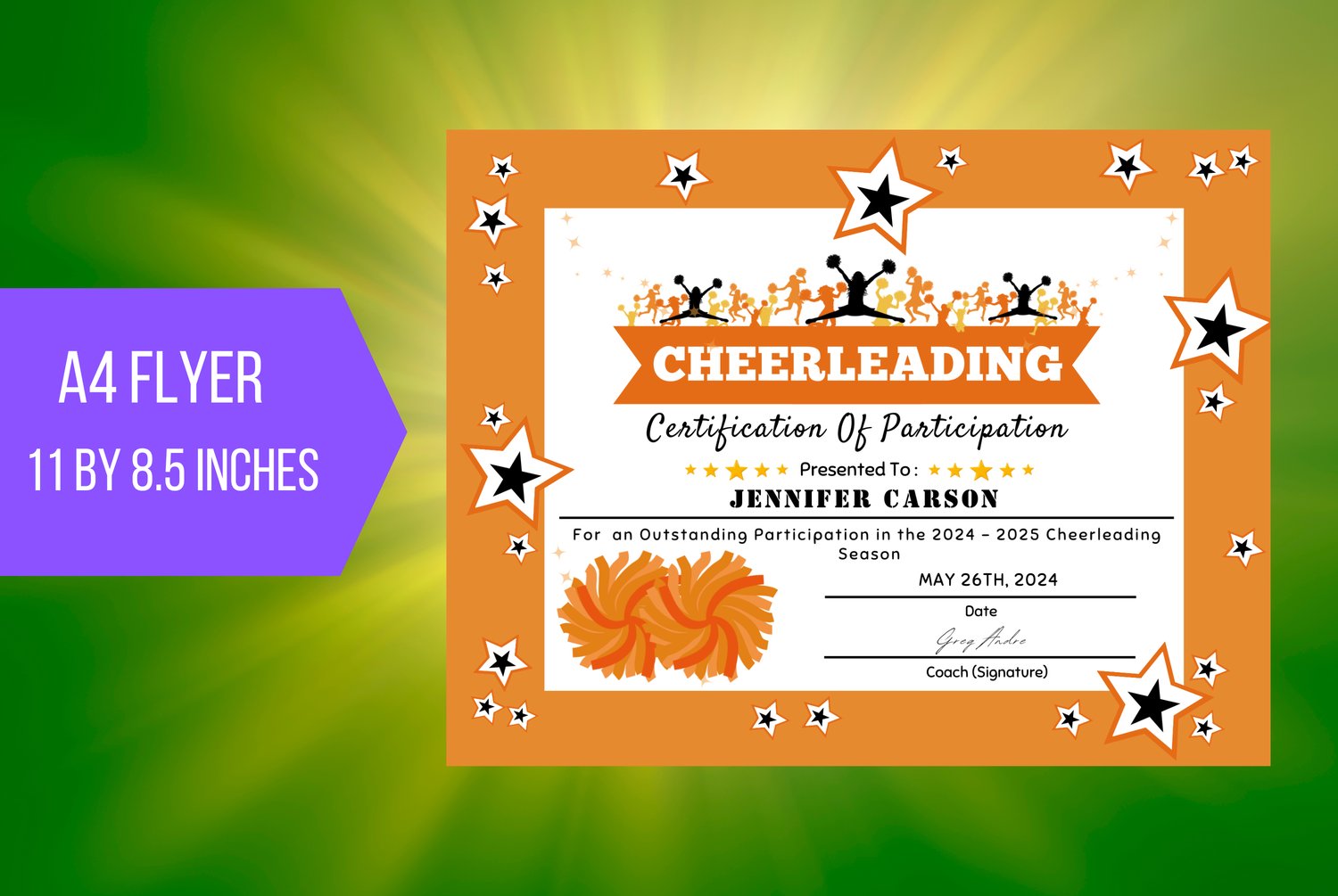 Step into a vibrant and energetic celebration of achievement with our 'Cheerleader Certificate'. This spirited design captures the high-energy, supportive vibe of a sports recognition event, bursting with colour, fun, and athletic charm. It’s the perfect choice for promoting school spirit, presenting end-of-season awards, hosting youth sports banquets, or celebrating cheer camp graduations. Featuring dynamic silhouettes of cheerleaders in action and bold, orange pom-poms, the certificate instantly grabs attention with its playful energy and celebratory details. Shooting stars, a bold orange border, and a bright, star-studded palette create a joyful atmosphere that invites everyone to come together, celebrate hard work, and have a great time. The clear layout highlights key recipient details and achievements while keeping the design fun and engaging. Easily customize on Canva.com.and get the awards ceremony started with this editable template. Get yours today! Try editing using this free trial template.